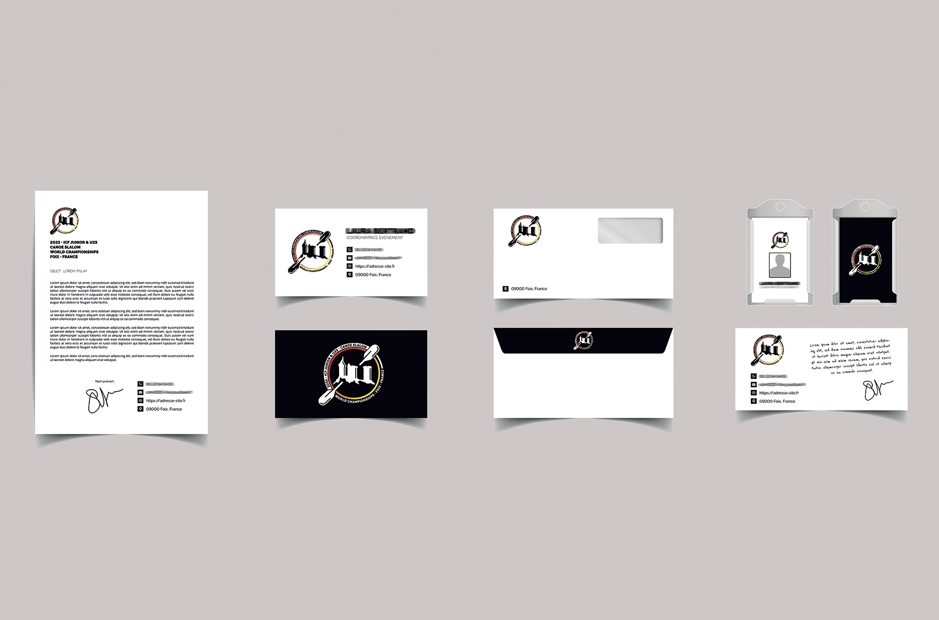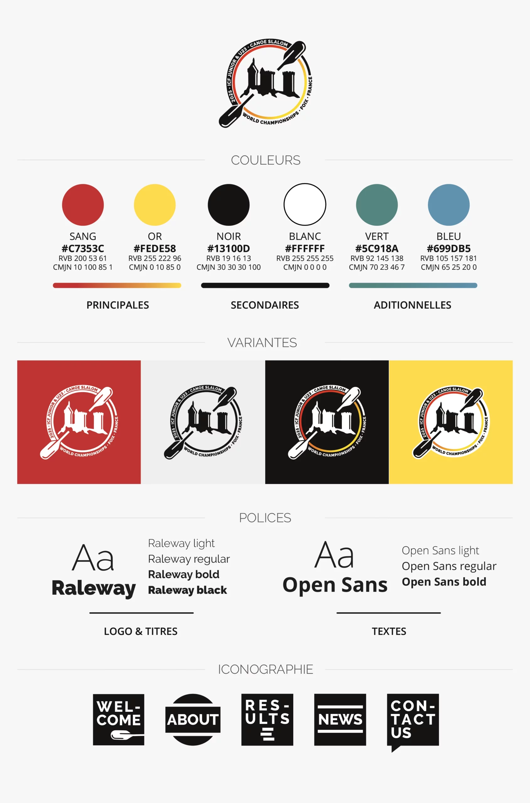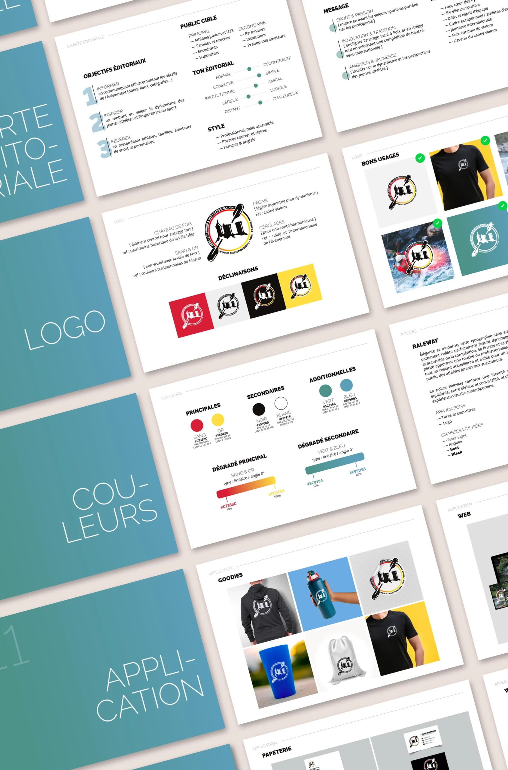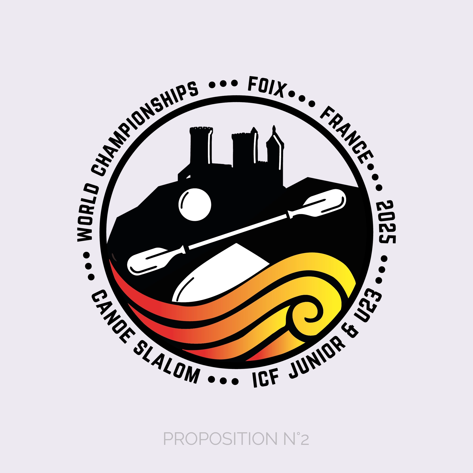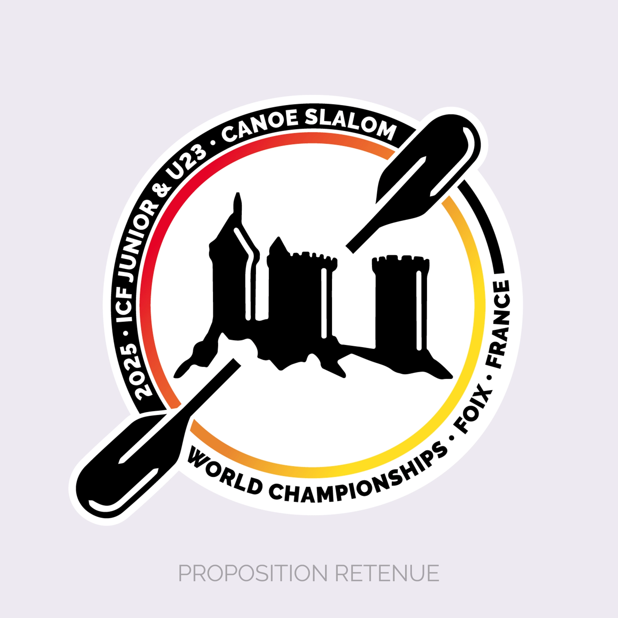 — Création d’un logo fort et symbolique, associant le château de Foix, symbole du patrimoine de la ville hôte, aux couleurs sang et or de son blason, tout en intégrant une pagaie légèrement asymétrique pour évoquer le dynamisme du canoë slalom, le tout unifié par des cerclages représentant l’unité et l’internationalité de l’événement.